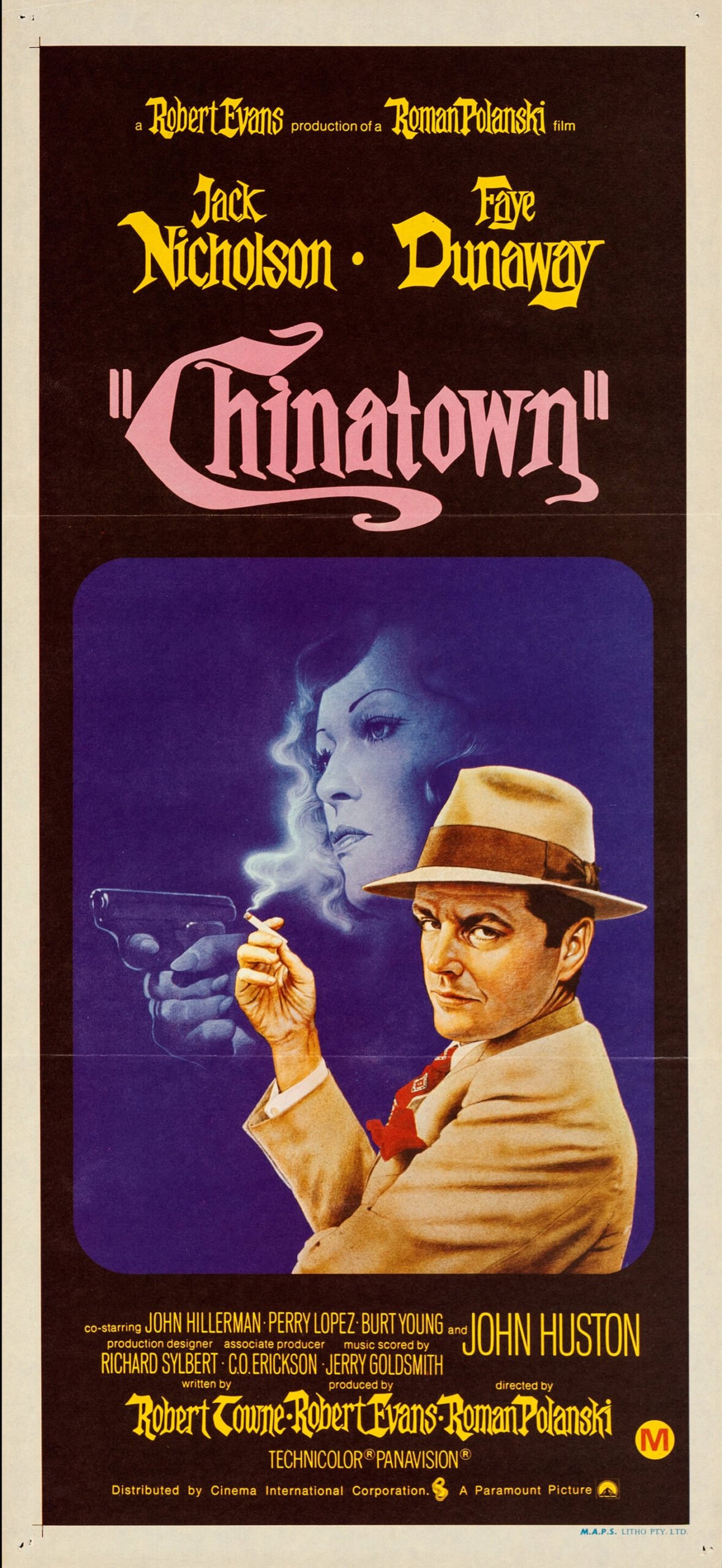 Starring Jack Nicholson, Faye Dunaway, John Huston, Perry Lopez, John Hillerman, Darrell Zwerling, Diane Ladd, Roy Jenson, and Roman Polanski. Directed by Roman Polanski.