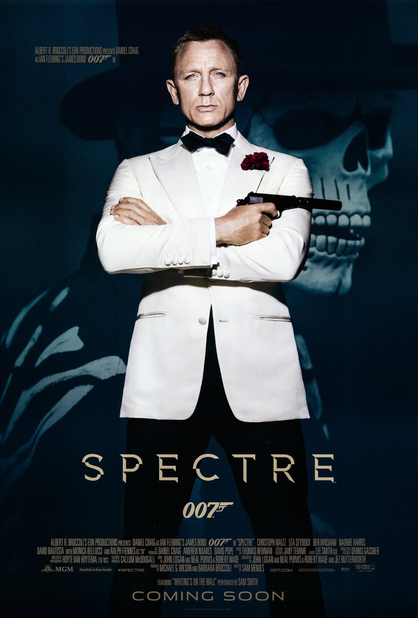 Starring Daniel Craig, Christoph Waltz, Lea Seydoux, Ralph Fiennes, Monica Bellucci, Ben Whishaw, Naomie Harris, Dave Bautista, and Andrew Scott. Directed by Sam Mendes.