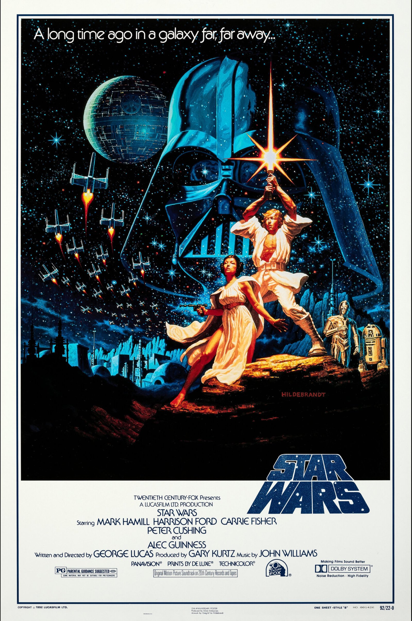 Starring Mark Hamill, Harrison Ford, Carrie Fisher, Alec Guinness, Peter Cushing, Anthony Daniels, Kenny Baker, Peter Mayhew, David Prowse, and the voice of James Earl Jones. Directed by George Lucas.